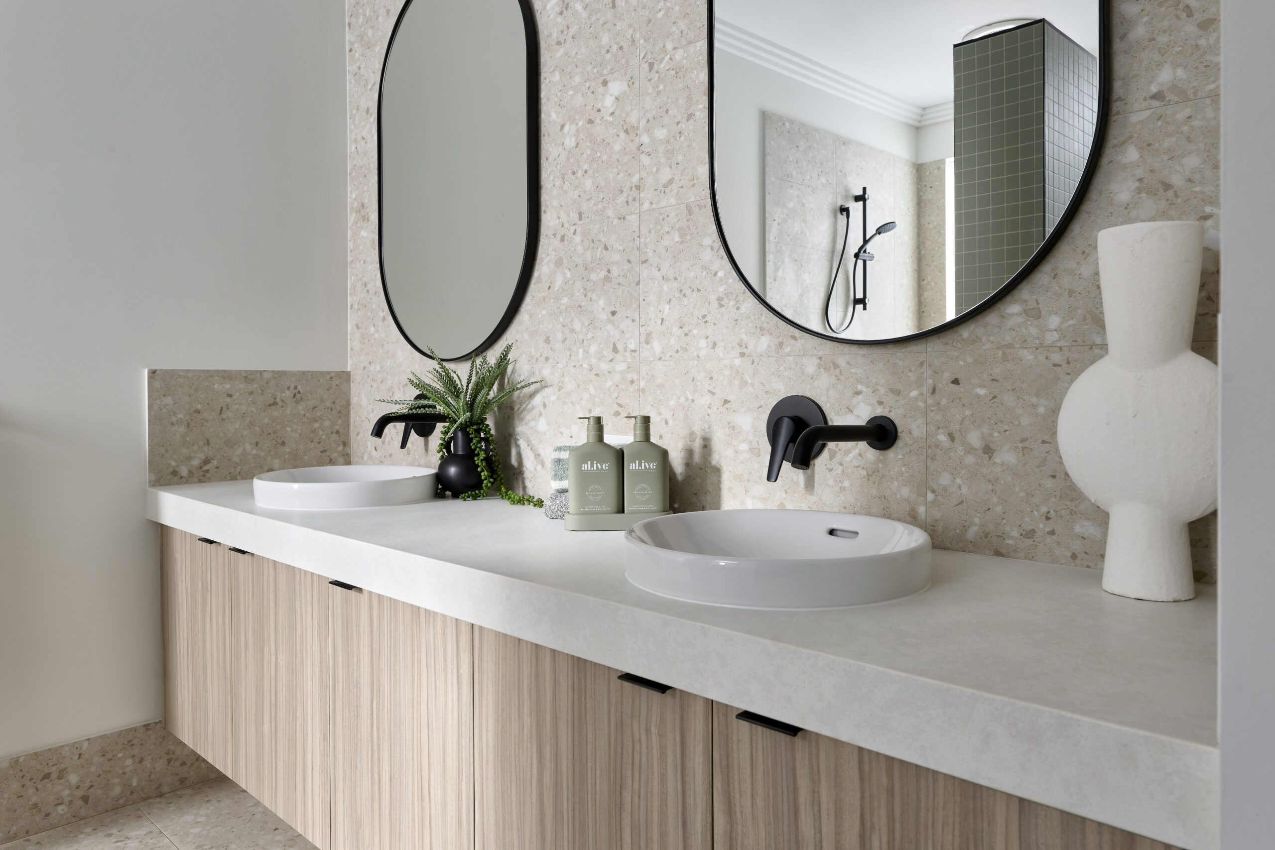 – 20mm Essastone benchtops in kitchen, bathrooms, and laundry.