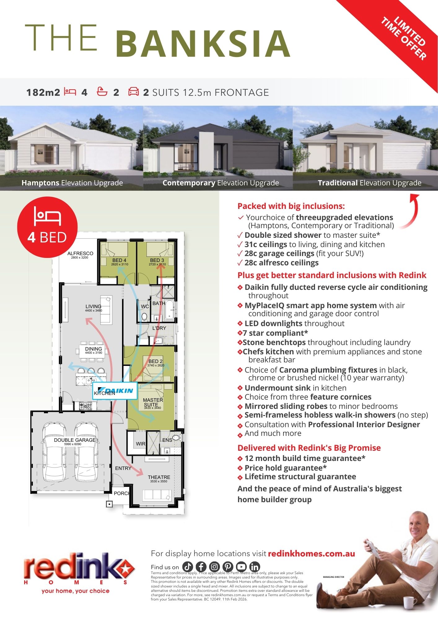 *A building contract will be entered into with Redink Homes for the home construction and site works and a separate land contract must be entered with the landowner as Redink Homes do not own the land. The listed lot is available at the time of print however may be sold by the owner without notice. If this is to occur a similar sized and priced lot may be offered and the package price will be adjusted accordingly.
