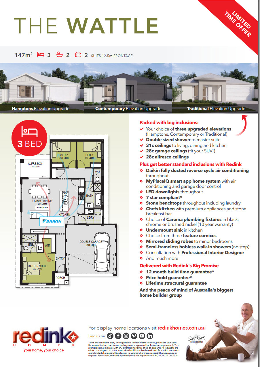 *A building contract will be entered into with Redink Homes for the home construction and site works and a separate land contract must be entered with the landowner as Redink Homes do not own the land. The listed lot is available at the time of print however may be sold by the owner without notice. If this is to occur a similar sized and priced lot may be offered and the package price will be adjusted accordingly.