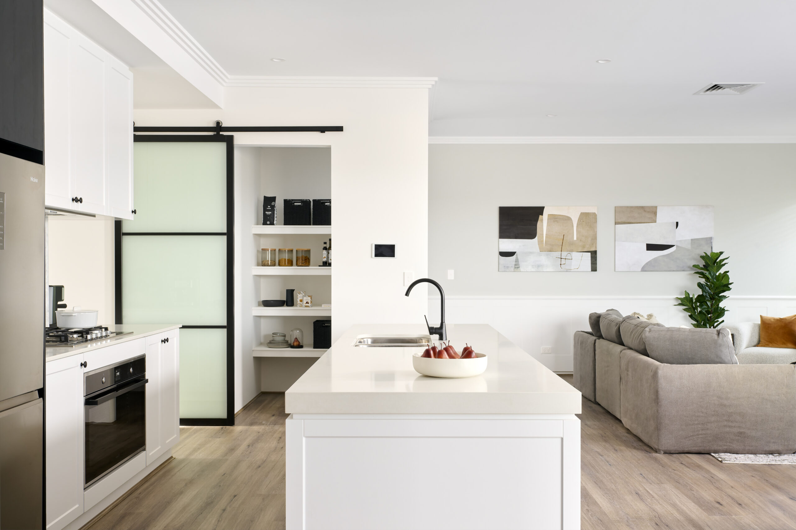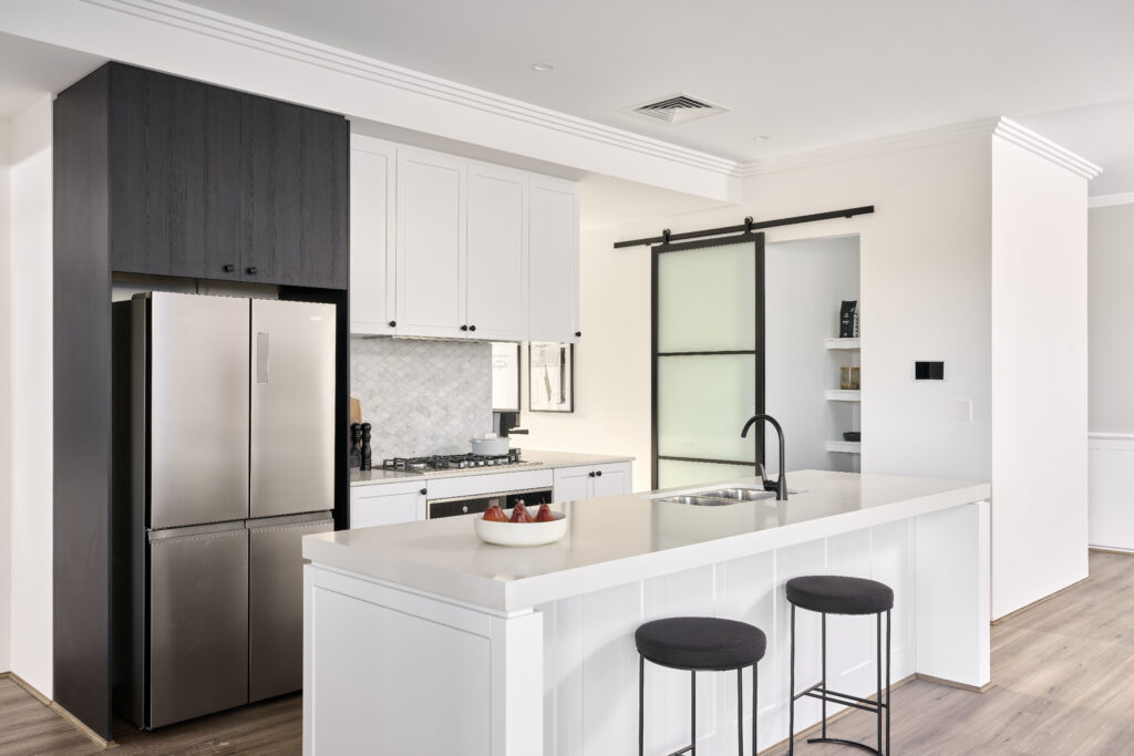 -20mm silica free stone benchtops from builders standard range with 300mm breakfast bar overhang