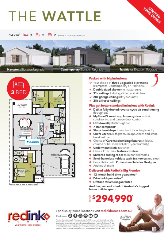 **A building contract will be entered into with Redink Homes for the home construction and site works and a separate land contract must be entered with the landowner as Redink Homes do not own the land. The listed lot is available at the time of print however may be sold by the owner without notice. If this is to occur a similar sized and priced lot may be offered and the package price will be adjusted accordingly.